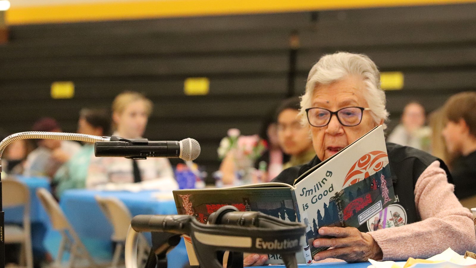 Language teacher Dana Roberts spoke about the importance of language, culture, and connection, setting the tone for the gathering. Respected Kwiakah Elder and author Sophia Dick shared a reading of her language book, Ɂlki da Mənxʷa (Smiling Is Good). The book was illustrated by Alex Maertz and Jessica Chickite, and students listened attentively as Sophia shared both the story and the meaning behind it.