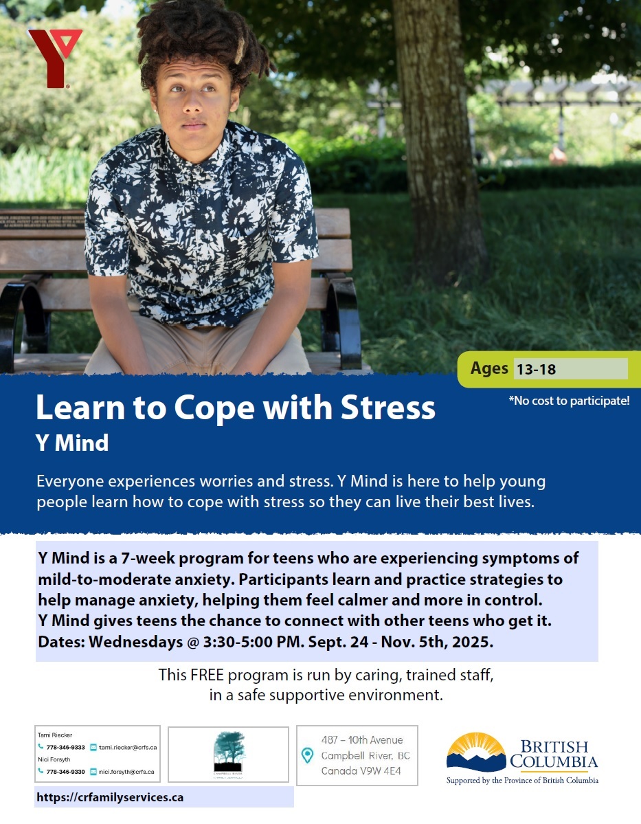Campbell River Family Services offers a free 7-week program for teens who are experiencing symptoms of mild to moderate anxiety, called Y Mind. Participants learn and practice strategies to help manage anxiety and help them feel calmer and more in control. This runs Wednesdays starting Sept 24 until November 5 from 3:30 to 5 p.m.