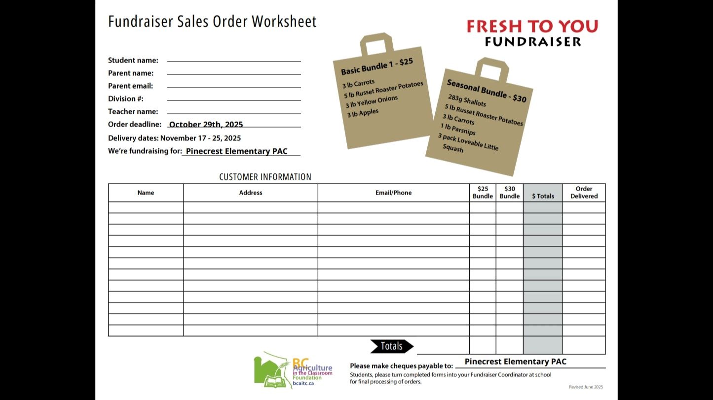 The "Fresh to You Fundraiser" is now available to all families. Please see attached flyer as well as the order form. Kindly note the PAC is organizing this fundraiser and if you have any questions please direct them to sd72pinecrestpac@gmail.com.
