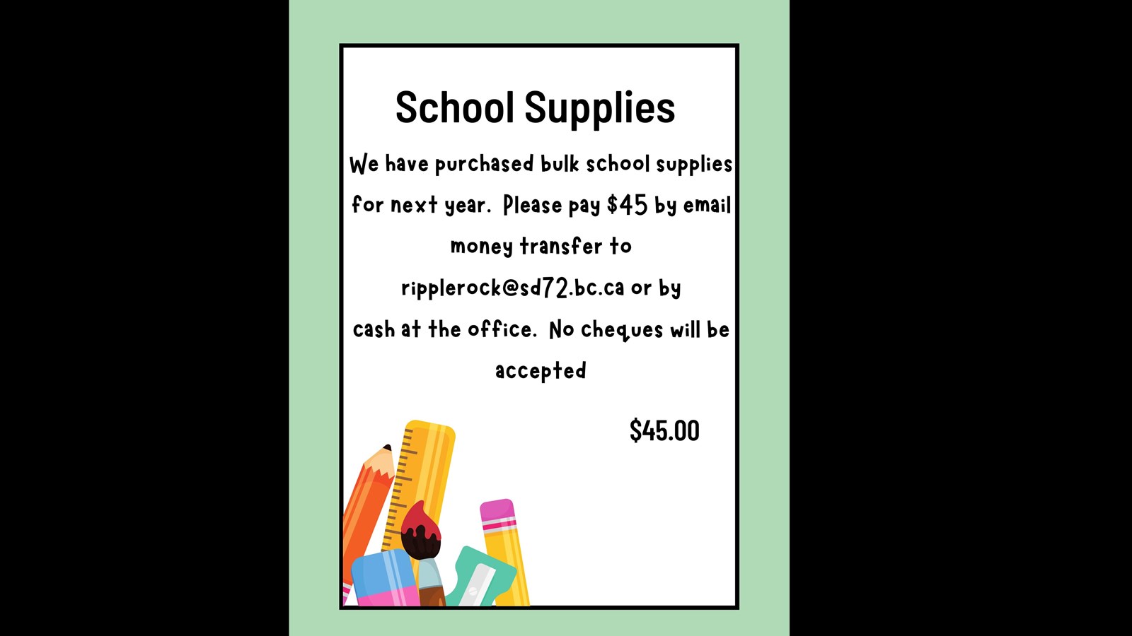 Please email money transfer $45.00 or cash at the office for school supplies for September 2023.